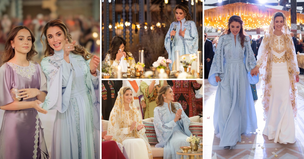 Ранија зрачеше со кралска елеганција во раскошна сина креација од Saiid Kobeisy, а идната невеста носеше бело-златна креација од Honayda Serafi.