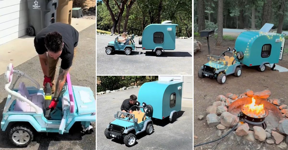 „12 часа, неколку дрвени плочи, стар автомобил на акумулатор од 25 долари на кој му недостасуваше тркало, неколку литри боја, некои додатоци за кампери и што имаме? Детство исполнето со камперски спомени. Го направив овој кампер за моите деца во текот на два дена и го завршив неколку часа пред да заминеме на првото кампување сезонава. Да, двете мои ќерки можат да се соберат целосно внатре“ – напиша тој во описот.