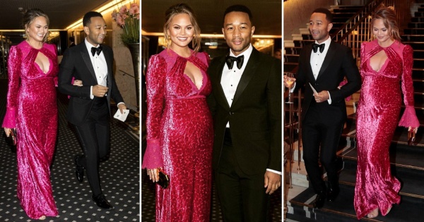 Криси Тиген го истакна трудничкото стомаче во розова креација покрај Џон Леџенд на банкет