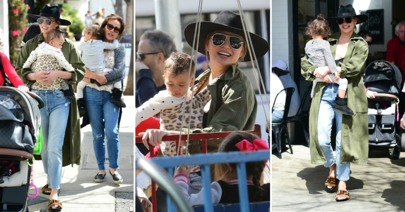 33-годишната сопруга на пејачот Џон Леџенд беше придружувана од мајка си, која редовно ѝ помага во грижата за децата. Познатиот модел го носеше бебето во кенгур со леопардски принт.