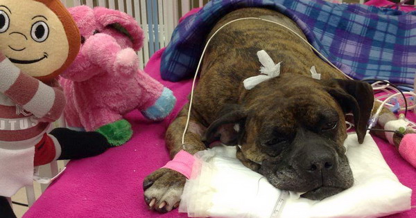 9-годишниот боксер е во критична состојба откако бил пронајден како со своето тело го покрива лицето на сопственикот Бен Ледфорд, обидувајќи се да го заштити од огнените јазици и чадот од пожар кој избувнал во нивниот дом.