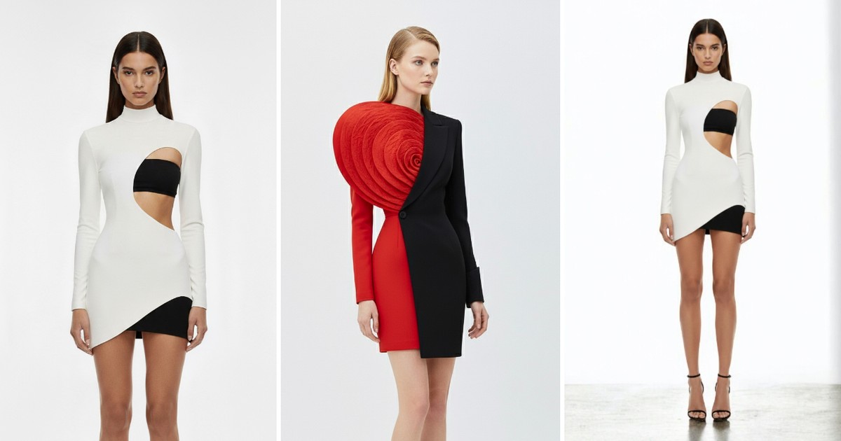 Овој модел ја претставува есенцијата на ТАО минимализмот. Ова е фустан со долги ракави и висока јака, изведен во елегантен монохроматски контраст на чиста бела и длабока црна. Неговата класична софистицираност е освежена со прецизни геометриски cut-outs на торзото, кои ја откриваат контрастната црна ткаенина под белата, креирајќи ефект на пресек. Силуетата е комплетирана со асиметрично здолниште, кое му дава ултра модерен изглед.