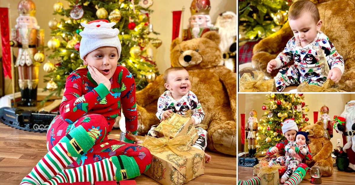 На нив, неговите синчиња Михаил и Димитриј позираат насмеани во неодолива новогодишна облека покрај големата елка.