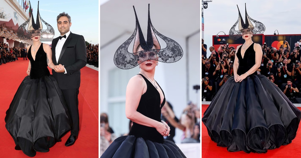 Лејди Гага во драматичен стајлинг со впечатлив додаток на главата покрај вереникот во Венеција