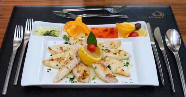 Во ресторанот во хотел Руссиа, лигњите се подготвуваат на скара. Ова е уште еден специјалитет кој задолжително им го препорачуваме на обожавателите на морска храна.