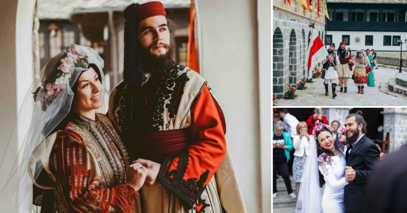 Љубов и традиција: Никола од Битола и Рената од Скопје во мијачки носии се венчаа во Бигорски манастир