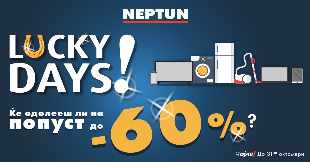 „Lucky days” од 25-31 октомври во „Нептун” - продажна акција со најголеми попусти! Ќе одолееш ли на ПОПУСТ до -60%?Вистинска можност за купување на производи со најголеми попусти и до 60 рати на HAPPY цени. Разгледајте ги понудите во сите продажни салони на Нептун ширум Македонија или онлајн на Neptun.mk и изберете од најголемиoт избор на: телевизори, фрижидери, машини за перење и сушење, плотни, фурни, лаптопи и таблети, мобилни телефони, мали апарати за домаќинство и апарати за нега и убавина од брендовите: Beko, Samsung, LG, Huawei, Sony, Apple, Grundig, Elektrolux, Candy, Asus, Acer, Lenovo, Fuego, Bosch, Tefal, Rowenta и многу други.