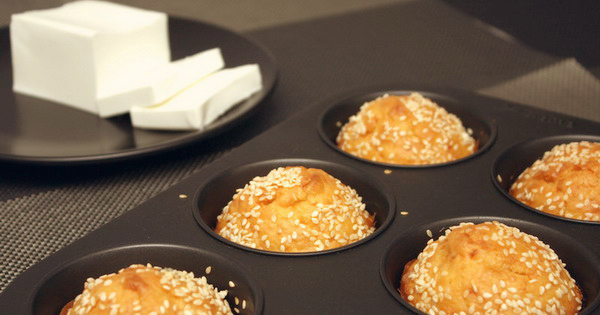 - Наполнете ги формите за мафини со добиената смеса и поросете со сусам.