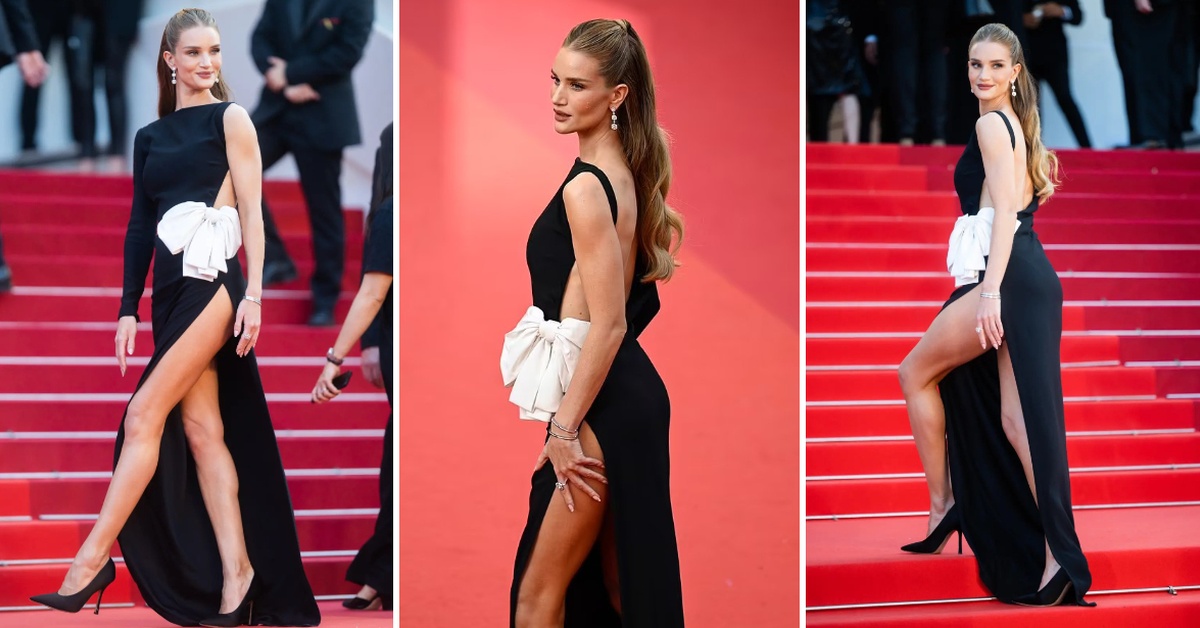 Роузи Хантингтон-Вајтли беше мамка за погледи во модно издание кое истовремено е смело и елегантно. На црвениот тепих на Канскиот филмски фестивал, 36-годишната манекенка пристигна во креација од Валентино, која од едната страна има висок шлиц и отворен грб.