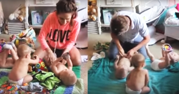 Мајка и татко се натпреваруваат кој побрзо ќе им ги промени пелените на нивните три бебиња