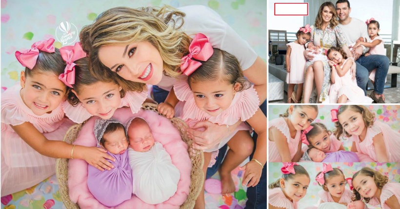 На фотографиите, Жаклин позира со новородените бебенца, кои ги добија имињата Емилија и Паула, трите поголеми ќеркички и нејзиниот сопруг Мартин Фуентес.