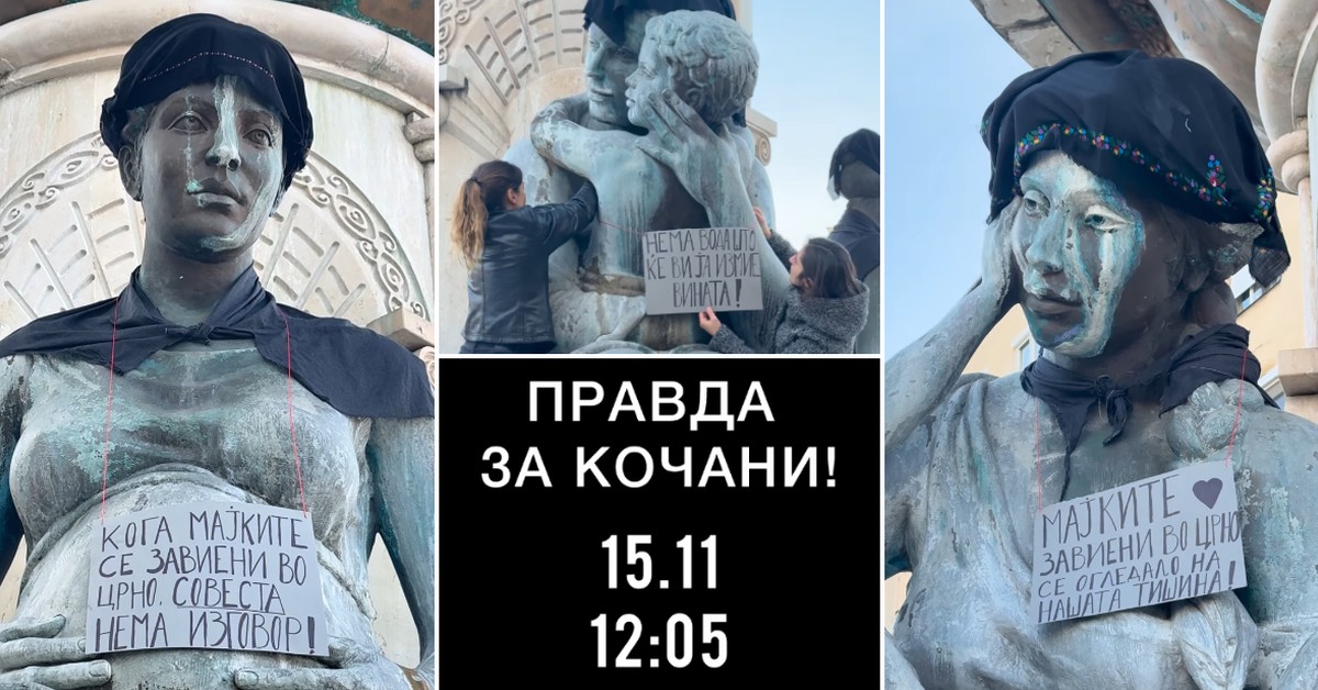 „Мајките завиени во црно се огледало на нашата тишина“, „Нема вода што ќе ви ја измие вината“, „Правда за Кочани“, „Кога мајките се завиени во црно, совеста нема изговор“... се пораките кои ги привлекоа погледите на минувачите.