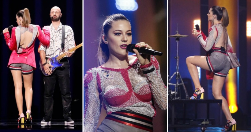 На големата сцена, пејачката се појави во креација во циклама боја, која наликуваше на сако закопчано наопаку, а потоа го соблече и под него носеше кратки панталони со боди со богата текстура. Марија носеше и колоритни сандали.