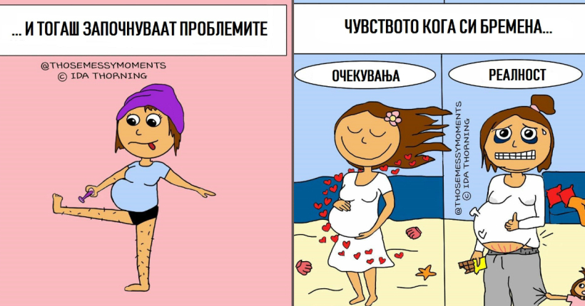 Растењето на трудничкото стомаче, киселините во стомакот, мачнините, грубите коментари... Сето ова на забавен начин го прикажува артистката Ида Торнинг во своите илустрации.