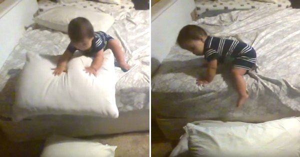 Во видеото, бебенцето фрла на подот неколку перници за да му биде меко кога ќе се спушти од креветот. Генијална идеја за толку малечко човече, нели?