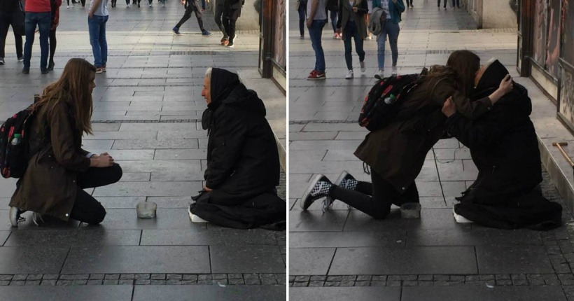 Направени од случаен минувач, фотографиите покажуваат девојка со ранец како разговара со баба која проси, а потоа тие искрено се прегрнуваат.