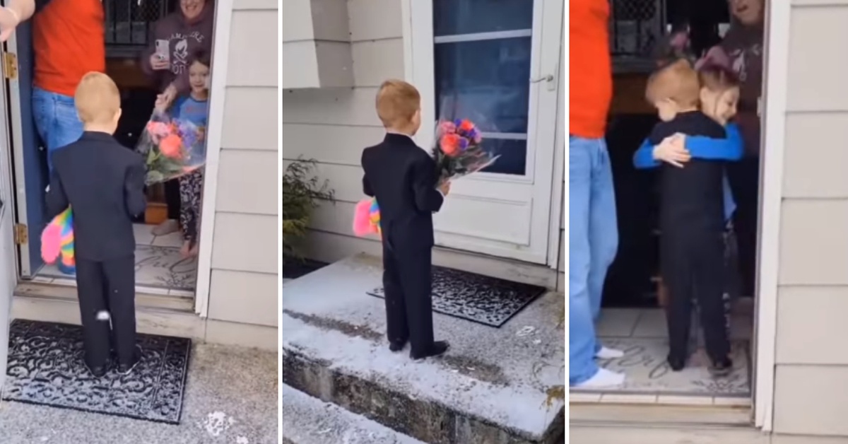 Мал романтичар: Дотерано момче со подарок и букет цвеќе ја изненадува симпатијата за Св. Валентин
