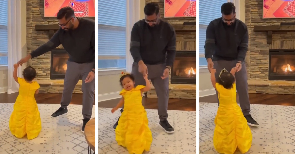 Мала принцеза: Девојче танцува со татко си додека гледаат романтична сцена на „Убавицата и ѕверот“