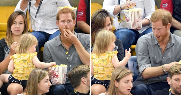 2-годишната Емили беше уловена од камерите како си грицка од пуканките на Хари, додека тој разговара со пријател. Во еден момент принцот го забележува тоа и на шега ги трга пуканките, а потоа пријателски споделува од нив со слаткото девојче.