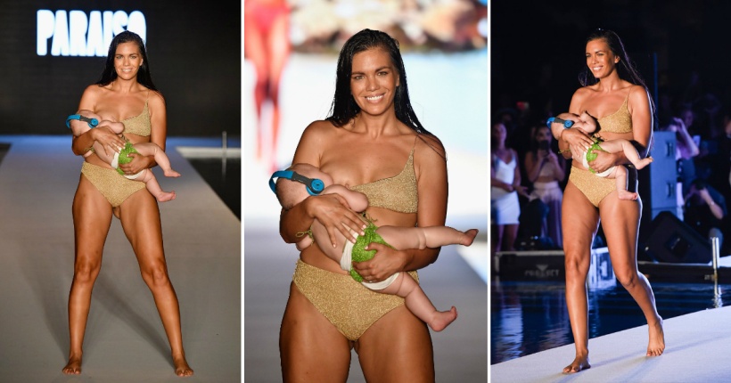 Манекенка го доеше бебето додека дефилираше на ревија за костими за капење, привлече море коментари