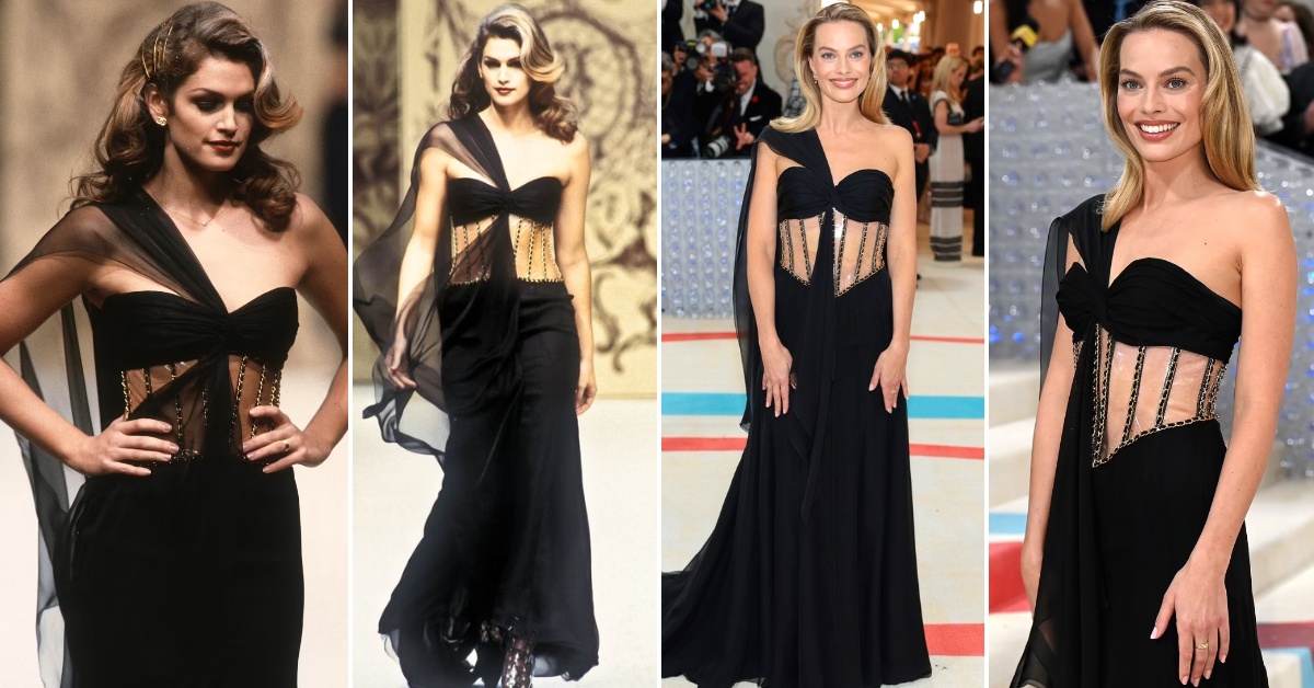 Марго Роби убавица во винтиџ креација од Шанел носена од Синди Крафорд на ревија во 1993 година