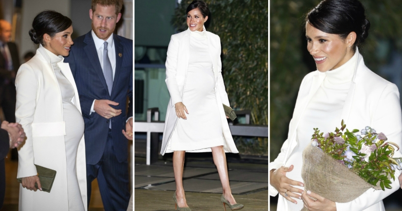 37-годишната војвотка од Сасекс блескаше во бела комбинација која обединуваше