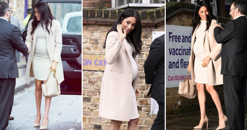 Бежовото палто од Армани таа го искомбинира со тесен ролка фустан од H&M кој чини 30 евра. Елегантните обувки се дело на Маноло Бланик додека чантата на Стела Мекартни.