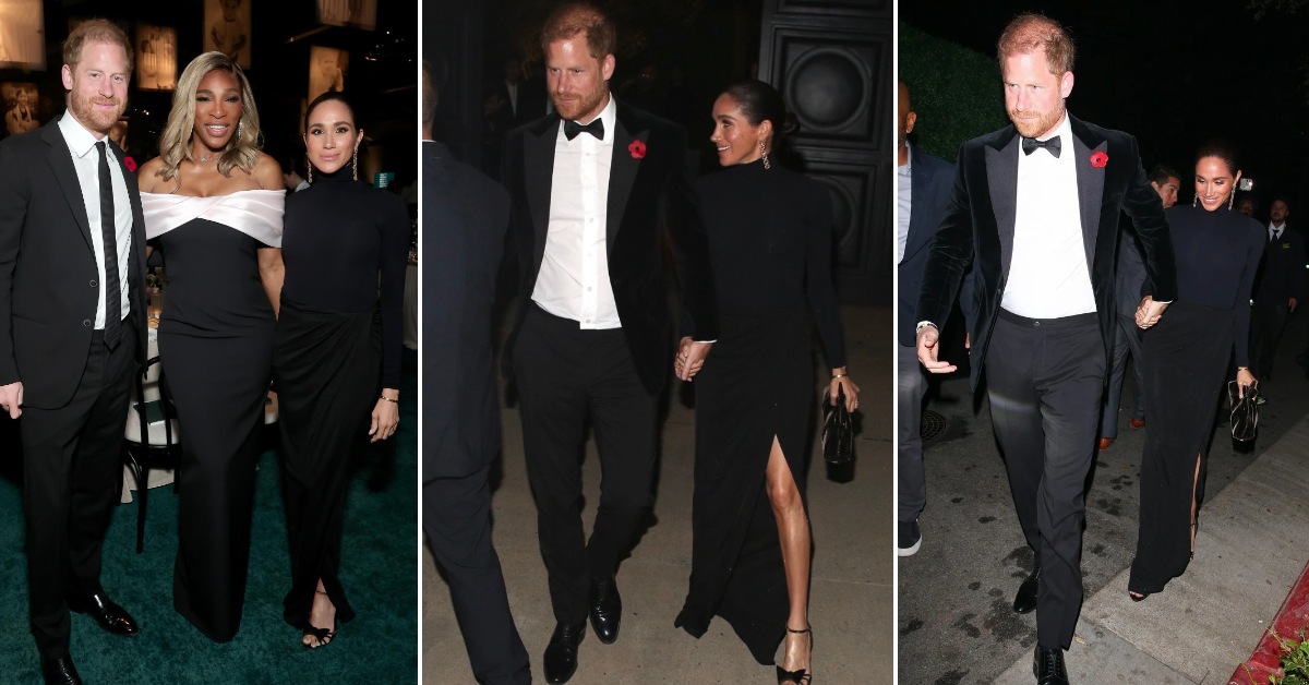 44-годишната војвотка од Сасекс и 41-годишниот принц беа модно усогласени за настанот на имотот на Џеф Безос во Беверли Хилс. Меган беше облечена во црн фустан со шлиц од Balenciaga, додека принцот Хари носеше црн костум и бела кошула.