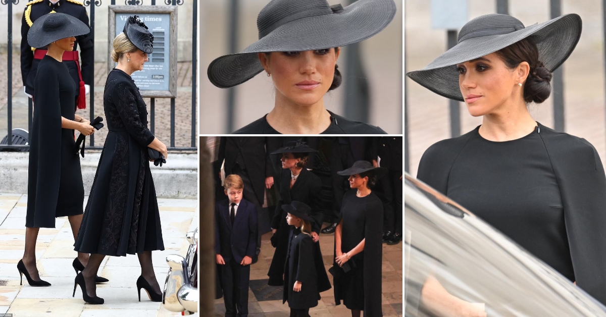 41-годишната војвотка од Сасекс носеше црн фустан со наметка и голем шешир во Вестминстерската опатија во Лондон. Во својот изглед, таа додаде бисерни обетки подарени лично од Кралицата.