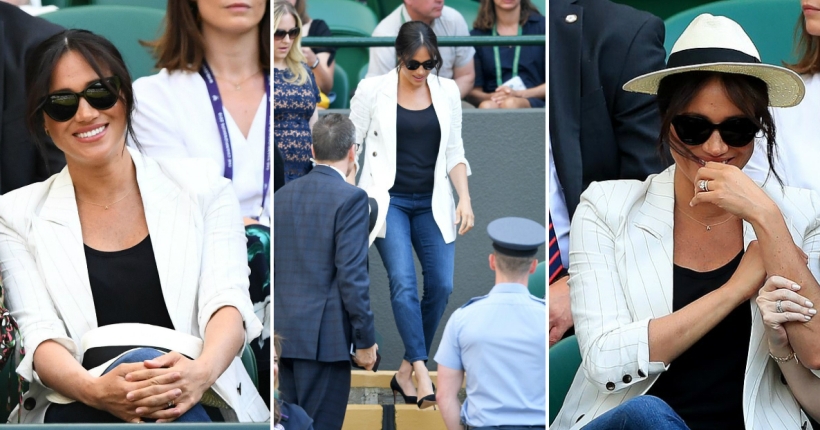 На трибините на престижниот тениски турнир, Меган се појави со две пријателки, а носеше кежул комбинација од тесни фармерки и сако со тенки риги од брендот L'Agence.