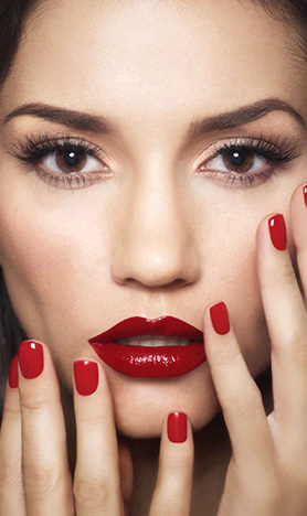 Минимална шминка на очите и крваво црвен кармин на усните.