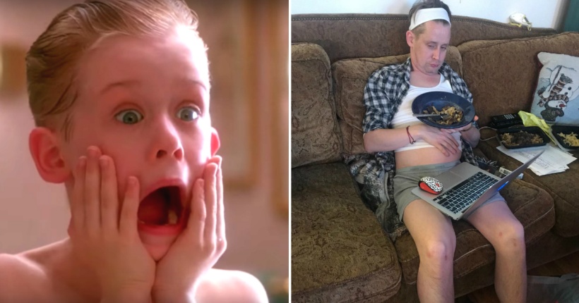 38-годишниот актер, кој го глумеше итрото дете во популарните филмови, објави фотографија на која седи на кауч со чинија во рацете и лаптоп во скутот.