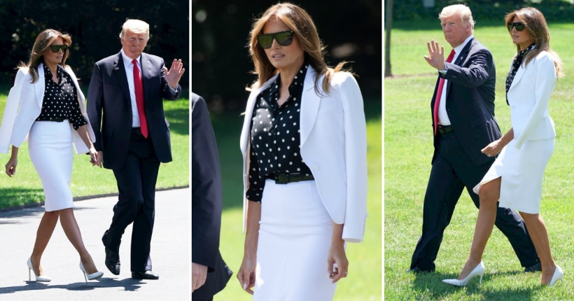 Првата дама на САД чекореше на тревникот на претседателската резиденција во бел костум со здолниште од Мајкл Корс и Сен Лорен кошула со точкест принт, кој моментално е моден хит. Стајлингот таа го заокружи со обувки со потпис на Маноло Бланик.