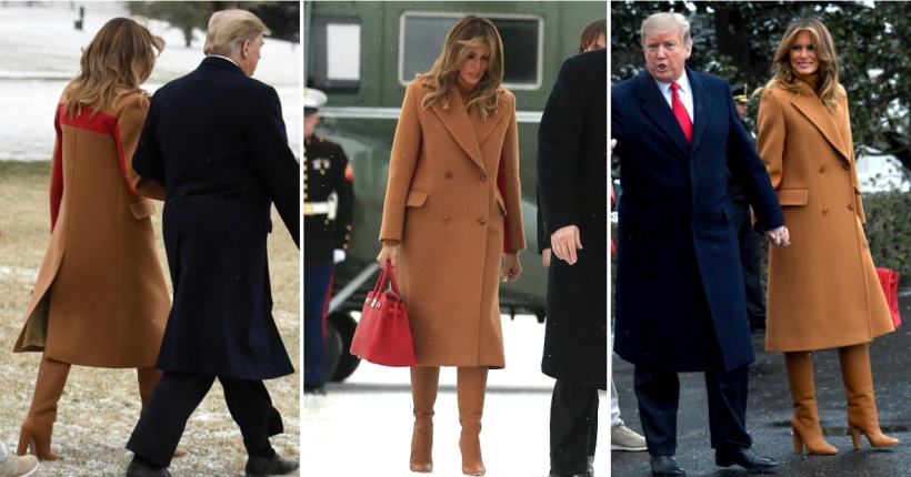 Додека од Белата куќа се упатуваше кон хеликоптерот со Доналд и синот Барон, таа шармираше во стајлинг во карамела нијанса надополнет со црвени детали.