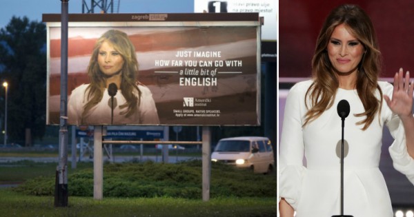 Последната шега што беше упатена на нејзина сметка, ја предизвика и контрареакцијата на првата дама, којашто ја ангажира својата словенечка адвокатка за да ја регулира ситуацијата. За што станува збор? Неодамна, школото за англиски јазик Американски институт од Загреб, во околината на Загреб постави билборди на кои, покрај фотографијата на Меланија Трамп, стоеше и слоганот „Just imagine how far you can go with a little bit of English“ или во превод „Замислете само колку далеку можете да стигнете со малку англиски“. Алузијата е повеќе од јасна.