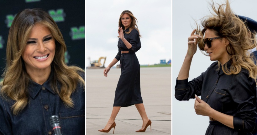 Првата дама на САД со шик стајлинг ги привлекуваше објективите на фоторепортерите. Миди фустанот од темен тексас е дело на брендот Lafayette 148 New York, а кафеавите салонки се со потпис на Маноло Бланик.