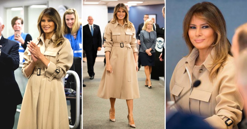 Првата дама носеше бежов палто-фустан од Céline и обувки од Jimmy Choo за посетата на Федералната агенција за управување со вонредни состојби во Вашингтон, каде се дискутираше за превентивни мерки за заштита од урагани.