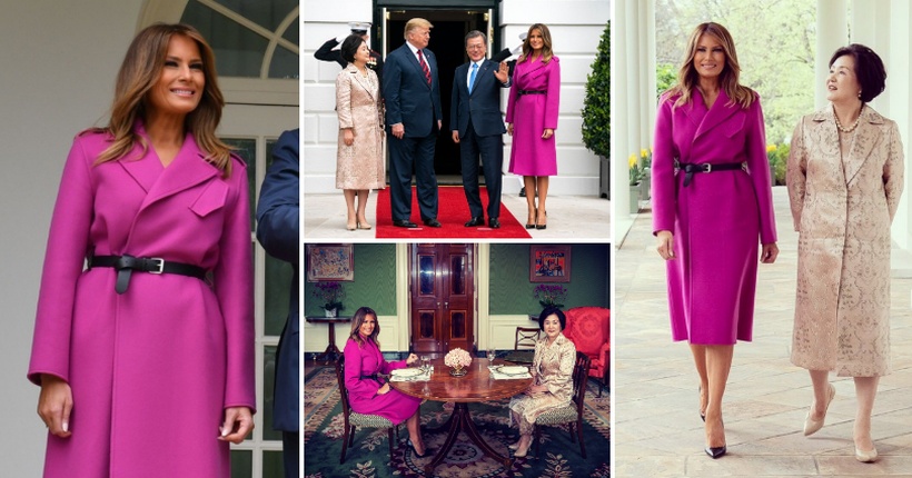На официјалната средба во Вашингтон, Првата дама на САД носеше впечатливо палто од Луј Витон, кое чини 4.750 долари, со тенок црн колан на половината. Стајлингот на Меланија беше надополнет со црни салонки од Кристијан Лобутин.