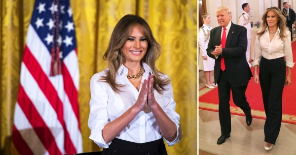 47-годишната прва дама на САД носеше бела кошула од Долче и Габана и црни панталони од Ралф Лорен.