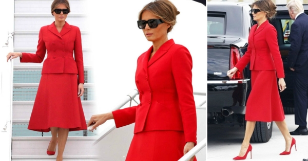 Првата дама избра креација од француската модна куќа Кристијан Диор. Црвениот костум со здолниште Меланија го избрала во консултација со дизајнерот Ерв Пјер.