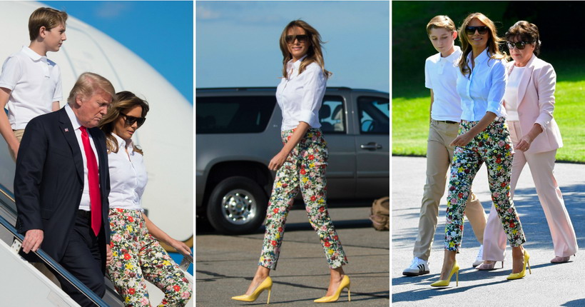 Меланија носеше цветни панталони од Ердем, бела кошула и жолти чевли со потпис на Маноло Бланик.