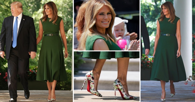 На настан во Белата куќа, 49-годишната Прва дама на САД се појави во едноставен зелен миди фустан, кој го надополни со цветни обувки со црвен ѓон од незаменливиот Кристијан Лобутин.