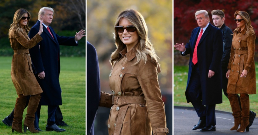 Меланија го придружуваше Доналд облечена во модерна монохроматска комбинација со палто Барбери и чизми Сен Лоран.