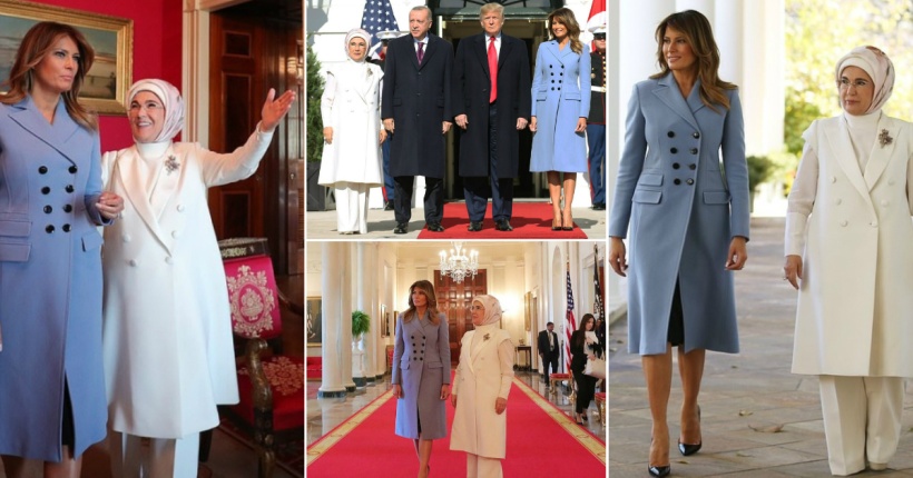 Меланија беше облечена во светлосино палто од брендот Altuzarra и црни салонки од Кристијан Лобутин додека Емине носеше светла комбинација со палто без ракави.