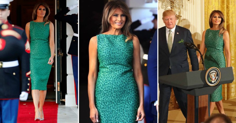 Почитувајќи ја бојата која се сврзува со овој ирски празник, првата дама на САД избра фустан во смарагдно-зелена боја. Креацијата со леопардски принт е дело на Брендон Максвел. Чевлите со змиски дезен доаѓаат од ателјето на Кристијан Лобутин.