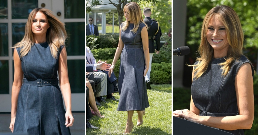 Првата дама на САД со широка насмевка се појави во градината на Белата куќа во тексас фустан од Емилија Викстед и „лобутинки“ и се дружеше со гостите.