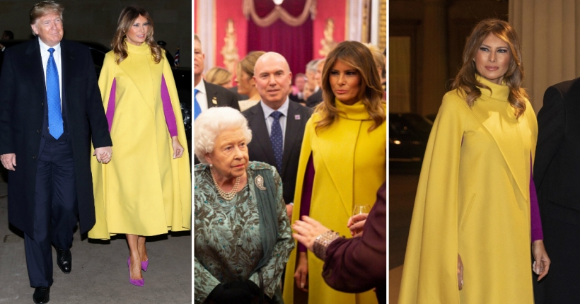 Меланија Трамп во жолто палто со наметка од Валентино на прием кај кралицата Елизабета во Бакингемската палата