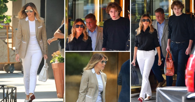 Меланија и ден претходно беше видена како го напушта облакодерот Trump Tower во светла комбинација со сако Барбери, чанта Ермес и балетанки Лобутин.