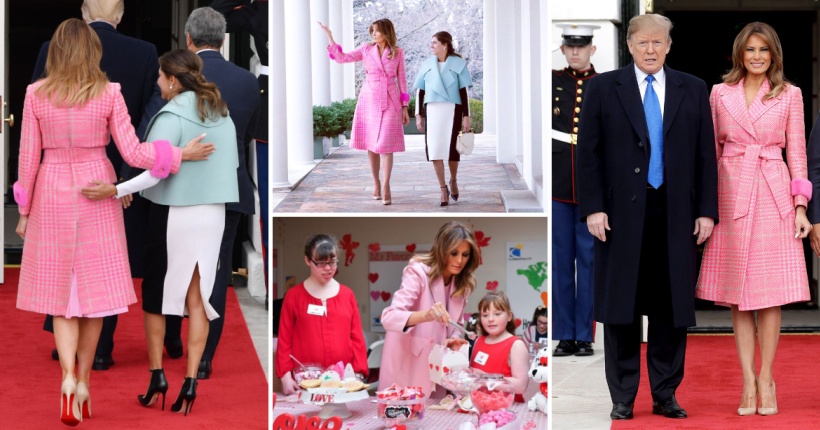 На Денот на вљубените, Меланија посети болни дечиња во здравствен институт во Мериленд каде се појави во комплетно розов стајлинг. Палтото е од Cedric Charlier и чини околу 1.600 евра.