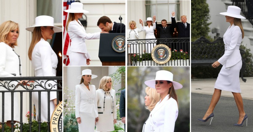 Првата дама на САД ги привлече сите погледи во женски бел костум од Мајкл Корс и фармерски обувки од Кристијан Лобутин, но највпечатлив елемент во нејзиниот стајлинг беше белиот шешир од Ерв Пјер.